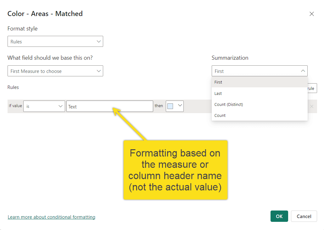 Power BI’s conditional formatting rules cannot be applied directly to a Field Parameter. The rules bind to a specific column or measure name, not to the dynamic result of the parameter.